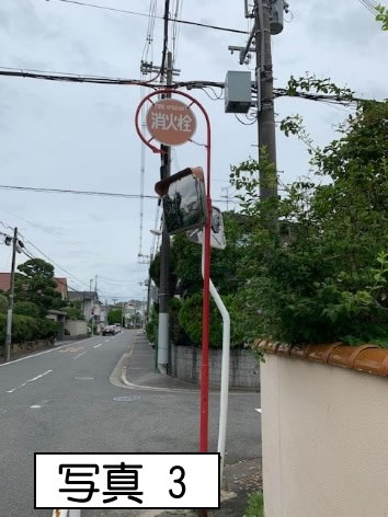 通りすぎるとすぐ右手に消火栓の立札(写真3)があります。